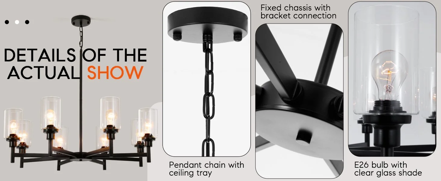【Farmhouse and Classic Style Chandelier】The black chandelier is made of 8 clear glass shades and a sleek black metal frame, offering a minimalist and classic look that complements both modern and farmhouse decor. 8-light farmhouse pendant lighting perfect used in kitchen island, dining room, kitchen, dining table, living room, restaurant, and more.