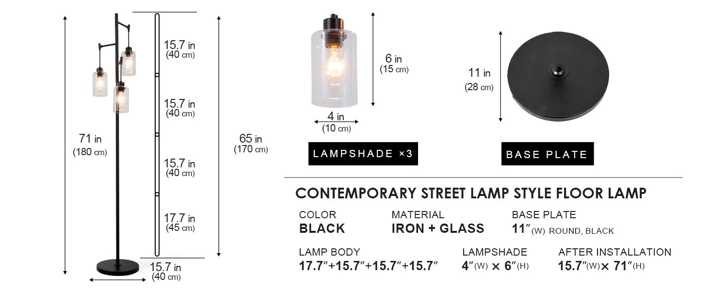 The 3-light wrought iron floor lamp are placed vertically at 90° with an upgraded humanized height of 70'', ensuring 360° full angle illumination. The simple clear glass lampshade provides elegant, warm light, creating a cozy atmosphere while protecting your eyes.