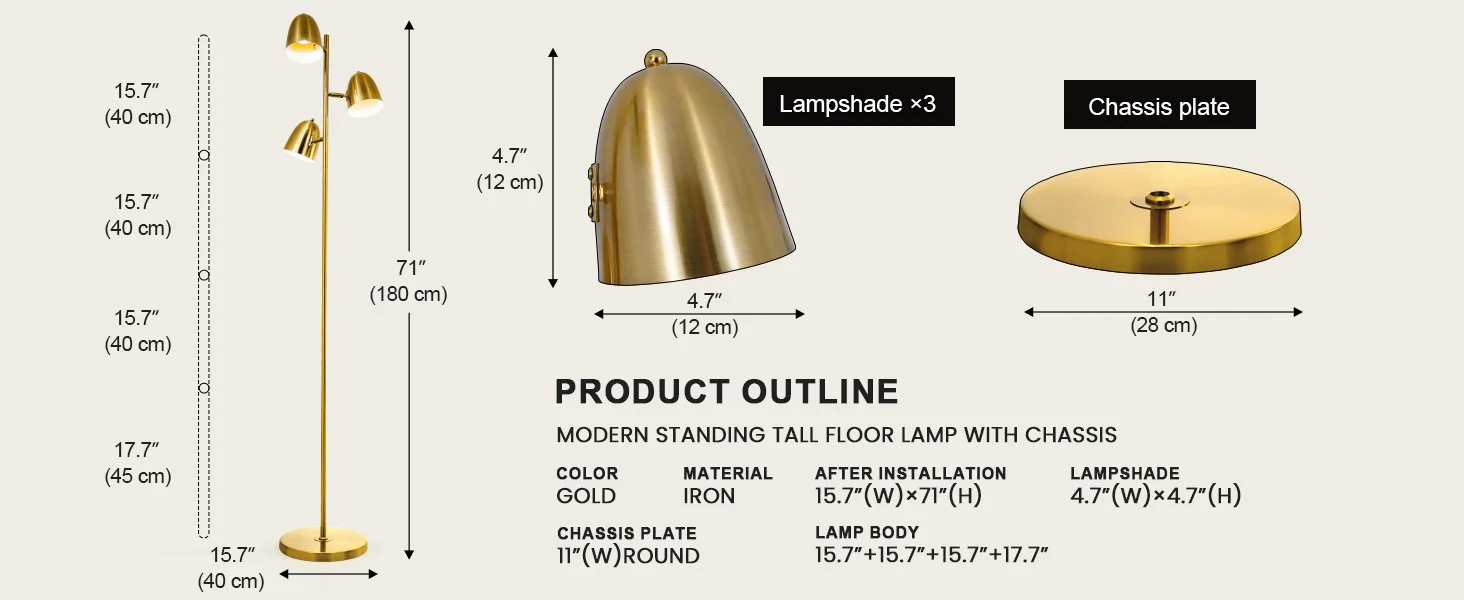 【GU10 Bulb Socket and Dimension】The farmhouse standing lamp requires with 3 GU10 LED bulbs, 60W Max (Bulb Not Included), 70" upgrated humanized height, base is 11" wide at the bottom. Each shade is 4" high x 4.5" wide. Weighs 12.5 lbs. Fully assemble fixture size is is 70" high x 15.7" wide. weighted black finish metal base and globe shades. 78.7'' long black power cord.