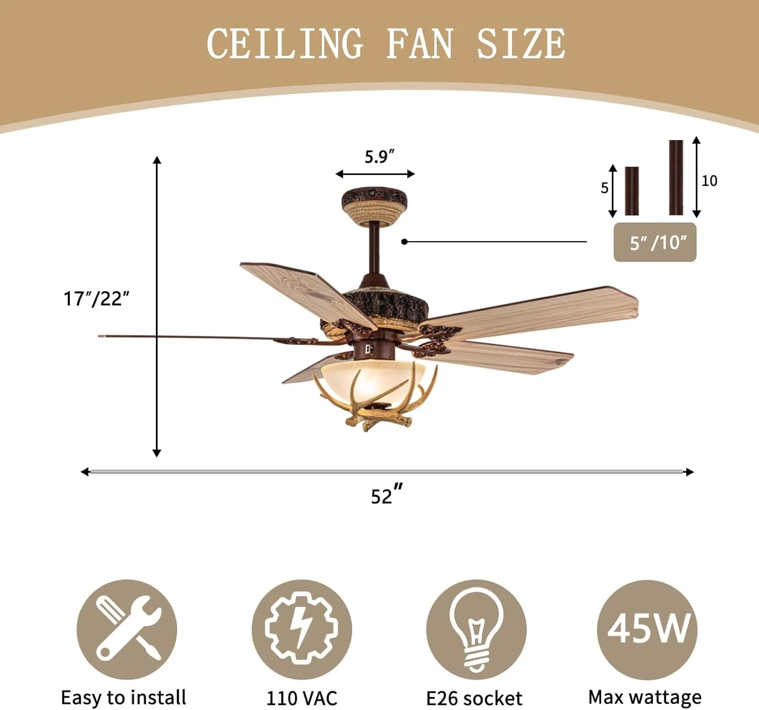 【Unique Design】: Brown metal, unique designed of antler tip decoration, simple and modern, but rustic, antastic air circulation, farmhouse ceiling fan with light adds so much to the room and make you a warm home