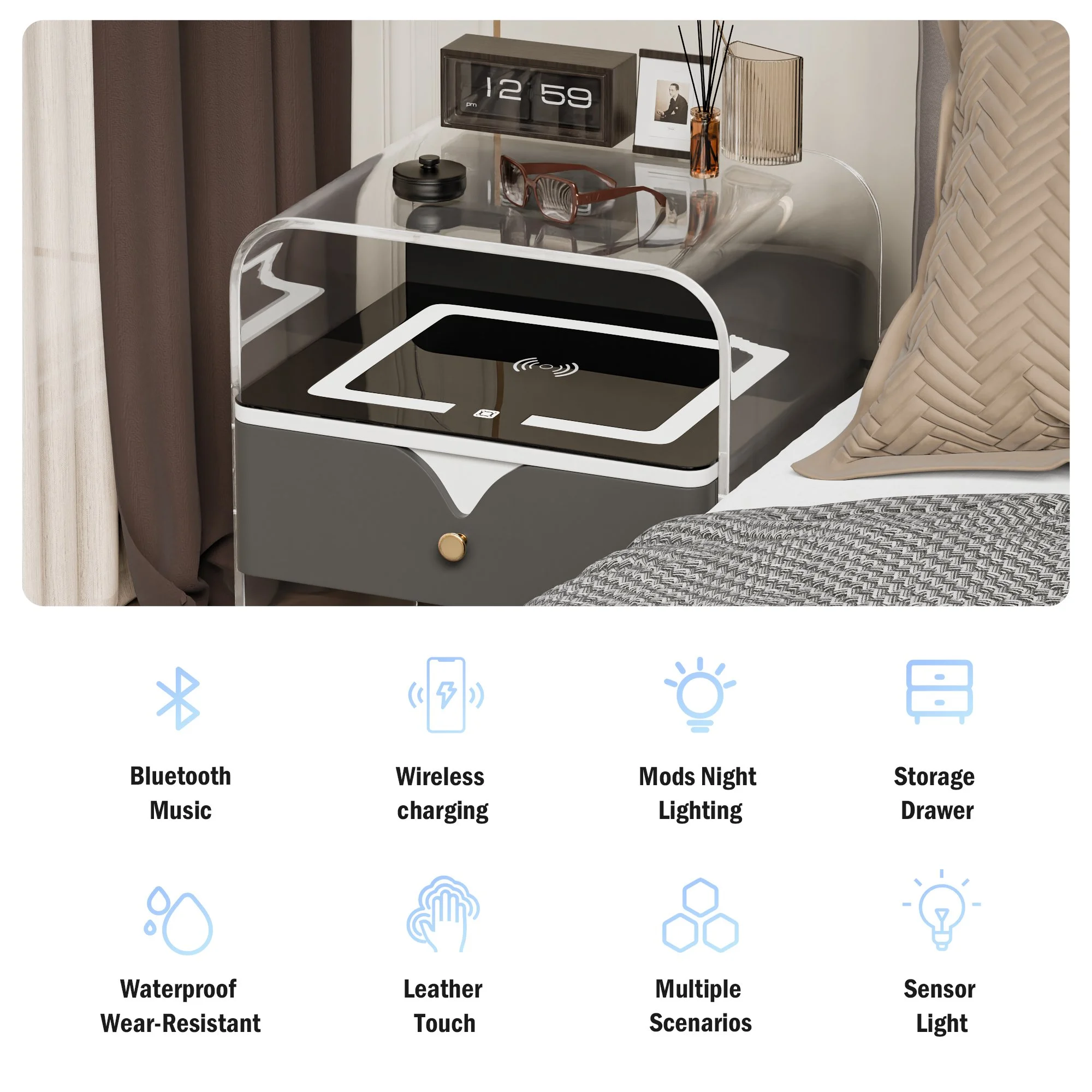 Smart Acrylic Nightstand with Wireless Charging, LED Light & Bluetooth Speaker-ELQ523